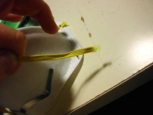 Usted puede dejar la máscara así, agarrándola con las manos en la cara te protegería, pero si quieres manos libres, puedes volver a utilizar las correas amarillas y enganchárselas a la nuestra máscara casera.