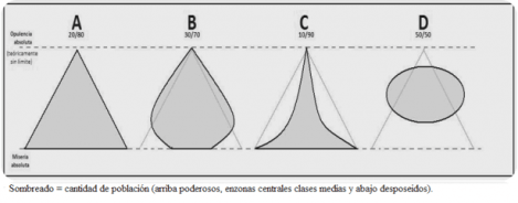 (Nota: estos 4 modelos no tienen por qué ser exactos, son tendencias, representaciones idealizadas de las diferentes posibilidades que tiene una sociedad, en cuanto a la igualdad o desigualdad de sus habitantes en el acceso a los recursos)
