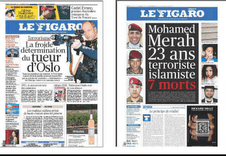 Aquí tenemos dos portadas del diario francés Le Figaro. En el primer crimen hubo 77 muertos, en el segundo 7. En la noticia del primero no hay ninguna referencia a su ideología o religión a pesar de que fue el móvil del asesino. En el segundo, a toda plana, se dice que es un terrorista islamista.