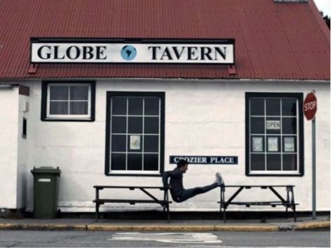Entre otros lugares, el aviso publicitario muestra a Zylberberg haciendo ejercicios delante de la Taberna Globe en la calle Crozier de Puerto Argentino/Stanley.