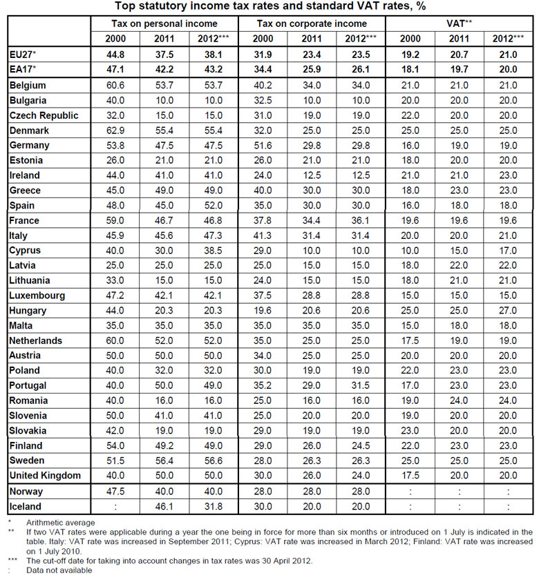 Los datos los publicó ayer Eurostat, la agencia estadística de la UE, y reflejan una intensa reducción de los tipos impositivos durante la década pasada. Esta evolución, sin embargo, se ha frenado en seco a raíz de la crisis, y, de hecho, la presión fiscal ha aumentado con fuerza en algunos países, principalmente en España, Grecia e Italia, en particular en el IRPF y el IVA. El Impuesto de Sociedades se ha comportado de una forma más estable.