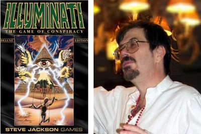 El creador de juegos Steve Jackson y su obra, Inwo, el Juego de Cartas Illuminati para el Nuevo Orden Mundial.