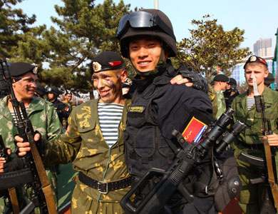 Soldados rusos compartiendo con soldados chinos un saludo de camadería durante las recientes maniobras militares conjuntas Rusia-China.