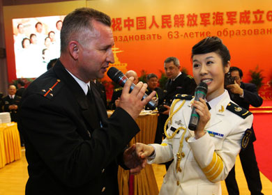 Un oficial ruso con una oficial china durantes las festividades de las maniobras militares conjuntas Rusia-China