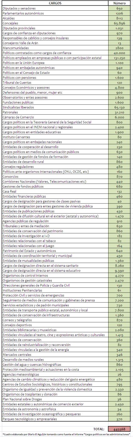 El estudio, del que Diario El Aguijón ha extraído la tabla anexa a este artículo, refleja que el lugar donde más políticos hay colocados es en empresas públicas o con participación pública (en su mayoría son autonómicas y municipales) donde hay empleados la friolera de 131.250 políticos. Le siguen los ayuntamientos, que emplea directamente a 8112 alcaldes y 65.896 concejales. A continuación les siguen los sindicatos y patronales. Entre los elementos especialmente curiosos están los cargos de designación directa en el sistema sanitario y el sistema educativo, donde hay empleados 8260 y 9320 políticos que realizan en su mayoría tareas de asesoramiento, planificación y control del resto de empleados públicos. También destacan los políticos empleados como cargos de confianza, que el informe detalla en 40.000 subrayando el informe, que la cifra se ha disparado por la práctica habitual de los grupos municipales y parlamentarios autonómicos a tener un determinado número de cargos de confianza respecto a su representación que realizan labores internas de los grupos, y que se solapan con las de los asesores personales que a su vez tienen los políticos electos. El informe, por tanto, pone negro sobre blanco que en España tenemos más jefes que indios.
