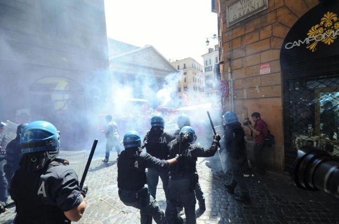 “Roma libre”, “Nosotros no pagamos la crisis”, fueron algunas de las consignas de los activistas pertenecientes al denominado movimiento “Blockupy Fornero”, que rechaza la iniciativa de reforma laboral que lleva el apellido de la ministra del Trabajo, Elsa Fornero.