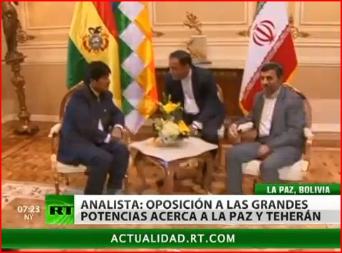 El presidente boliviano, Evo Morales, y su homólogo iraní, Mahmoud Ahmadineyad, se reunieron en La Paz, una de las paradas de la gira latinoamericana del mandatario de la república islámica, donde ratificaron su alianza antiimperialista y abordaron otros asuntos. «Irán y Bolivia están en contra de cualquier colonialismo y de la avaricia de ciertos estados que están en contra de nuestra libertad», dijo Ahmadinejad al finalizar su visita de seis horas a Bolivia.