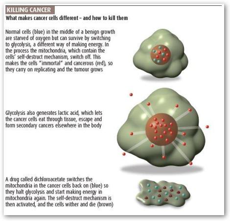 DCA restaura las mitocondrias en las células para hacerlas funcionar correctamente. Otra función de las mitocondrias normales está señalando la apoptosis, o autodestrucción celular. Las células normales se mueren y se reemplazan constantemente. Sin embargo, con las células cancerosas, la señal de la apoptosis se anula, por lo que las células cancerosas «inmortal». (3)