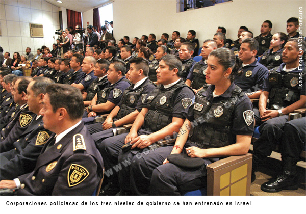 Alrededor de 50 policías federales, estatales y municipales ?entre ellos comandantes y jefes de alto rango? se entrenan cada año en Israel. La cooperación entre agencias de seguridad no sólo se da en Oriente Medio; en México, las empresas de seguridad israelíes ofrecen, incluso, aviones no equipados para el gobierno mexicano en el contexto de la “guerra” contra el narcotráfico, declara la embajada de Israel en México, en voz de Eldad Golán, consejero político y agregado de prensa y cultura. “Con el intercambio de información entre agencias de seguridad, se fortalecen los lazos entre ambos países”, señala el diputado priísta Alfonso Navarrete Prida