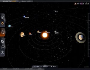 El icono que representa una mano con el dedo índice apuntando, que puede activarse o no, permite en el modo “heliocéntrico” desplazar un planeta sobre su órbita en el tiempo. La pestaña de un sólo icono permite la selección de vistas: heliocéntrica, geocéntrica y panorámica (telescopio).