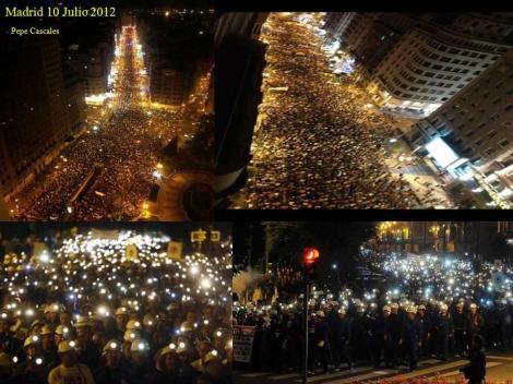 La ‘marcha negra’ convocada por los sindicatos en apoyo a la columna de 200 mineros del carbón, que llegó este martes a la capital tras andar durante tres semanas desde el norte de España, partió antes del mediodía de la céntrica Plaza de Colón con destino a la sede del Ministerio de Industria. Los mineros protestan por los recortes al sector implementados por el gobierno de Mariano Rajoy. La nueva manifestación se inició con explosiones de petardos que le imprimieron un fuerte olor a pólvora. Al frente del contingente se colocaron los trabajdores del carbón, apenas ocho horas después de haber finalizado por la madrugada en la emblemática Puerta del Sol la marcha nocturna del carbón. Los trabajadores denuncian el recorte del 60 % de las subvenciones al sector minero para este año, lo que provocará el cierre de las minas en las que trabajan.