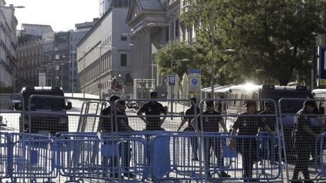Aunque la convocatoria inicial -efectuada a través de las redes sociales-era para acampar frente al Palacio de las Cortes, las fuerzas de Seguridad han vallado la zona y a las 21.30 horas impedían el acceso a los manifestantes, reunidos en las cercanías desde las ocho de la tarde.