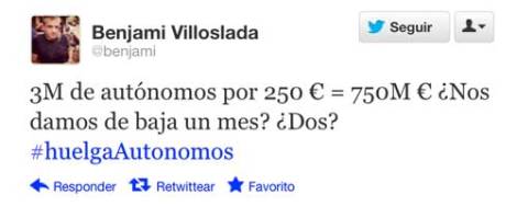 «3 millones de autónomos por 250 euros=750 millones. ¿Nos damos de baja un mes? ¿Dos?». Son las palabras de Benjami Villoslada, cofundador de Menéame, el pasado sábado.