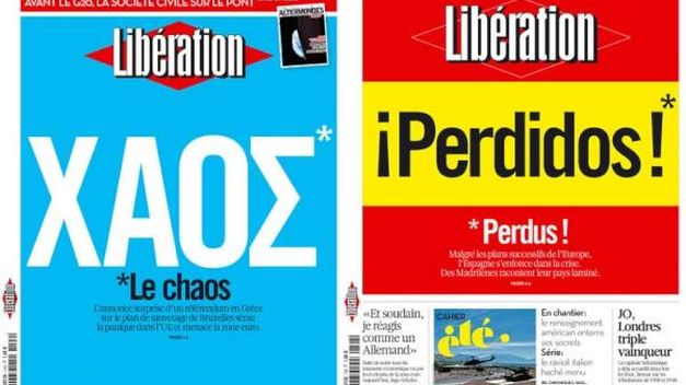 La portada es un calco de la publicada por el mismo medio en noviembre de 2011. En aquel momento, el diario francés hacia alusión a Grecia, en un momento crítico cuando el primer ministro griego dimitió y en su lugar, el tecnócrata Lucas Papademos asumió el control del país heleno.