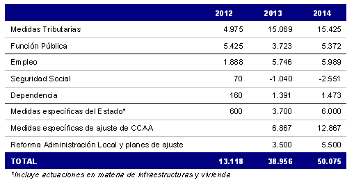 La tabla sale de la nota de prensa que La Moncloa acaba de colgar en su web. Son los datos brutos, entre recortes y subidas de impuestos, del plan presupuestario para los años 2014 y 2015 que ha aprobado hoy el Consejo de Ministros y que ya ha enviado a la Unión Europea. A la tabla le falta una casilla importante: el total. Tal vez en el Gobierno pensaron que era mejor no ponerlo, a ver si así nadie se daba cuenta del cambiazo. Estos son todos los números y entre ellos destaca una sorpresa: que el ajuste total es de 102.149 millones en los próximos dos años y medio, bastante más de los 65.000 millones de euros de ajuste que había anunciado el Gobierno hace apenas tres semanas.