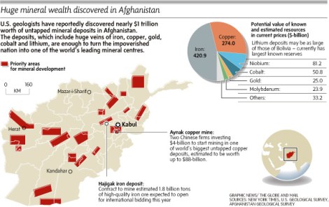 El hecho de que en Afganistán se encuentren recursos naturales lucrativos, fue reconocido indirectamente en el 2010 cuando el Ministerio afgano de minas lanzó un estimado de 1 billón de dólares (!) de lo que el país podría poseer, y The New York Times citó a una fuente en la Administración de EE.UU. diciendo que la lista de Afganistán de reservas incluyen cobre, oro, cobalto, e incluso litio, del que la industria de hoy en día es muy dependiente.