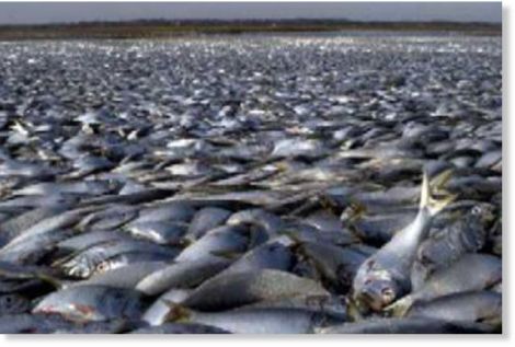 Peter Davis, de la Patrulla de Galveston Island Beach, dijo que los pequeños peces sábalo probablemente murieron por los bajos niveles de oxígeno en el Golfo de México.