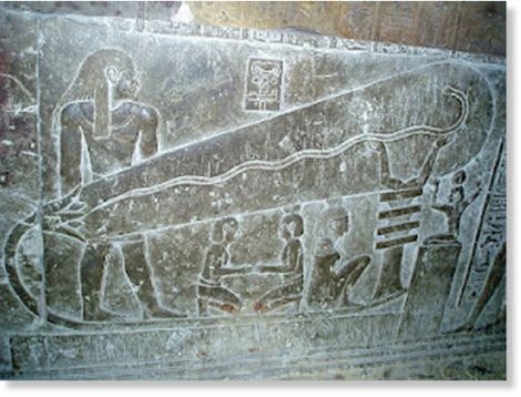 Entre los relieves del templo encontramos una curiosa representación de lo que parece una bombilla, lo que nos lleva a preguntarnos ¿usaban los egipcios luz artificial para moverse en el interior de las pirámides?
