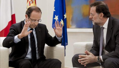 François Hollande se reunía este jueves con Mariano Rajoy en España por primera vez desde que ganara las elecciones presidenciales francesas. El encuentro parecía cordial y todo eran buenas palabras y gestos entre ambos, hasta que en la posterior rueda de prensa el presidente francés le lanzó a su homólogo español un dardo envenenado delante de todas las cámaras: «España es soberana para decidir si sí o no, y si sí, el cómo y cuándo», dijo Hollande, referido a la solicitud del rescate, agregando además que «es responsabilidad de España”.