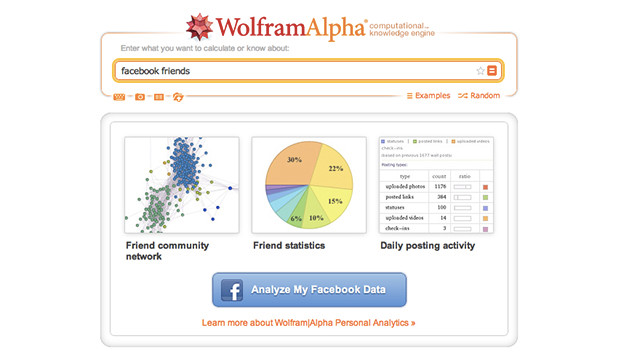 Crear un reporte de análisis extenso y personalizado sobre ti, basado en tus datos publicados en Facebook, es posible con una nueva herramienta de la empresa de análisis Wolfram Alpha. Solo necesitas ingresar al sitio, teclearFacebook report, hacer clic en el botón Analyze My Facebook Data y autorizar a la aplicación para acceder a tu perfil.