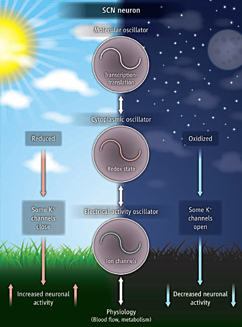 – Imagen 1) Modelo propuesto de la interdependencia relativa del oscilador de transcripción-traducción, el oscilador redox, y la membrana de oscilación de excitabilidad. Crédito: Mino D.C. Belle y Hugh D. Piggins/Science)