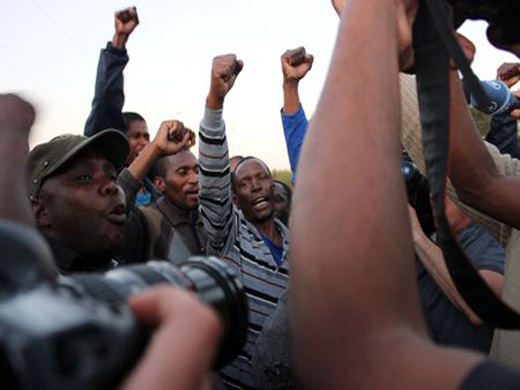 Los indignados sudafricanos se congregaron en la mina de platino Marikana, de la empresa británica Lonmin, y marcharon hacia la mina Karee para llamar a los trabajadores de esta veta a que se unan a la huelga.
