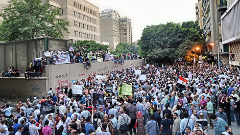 Un grupo de manifestantes trepó por las paredes del edificio y arrancó la bandera estadounidense. Los participantes en la marcha, convocada por grupos islamistas, enarbolaron el Corán, banderas negras que rezaban “No hay más Dios que Alá”, y pancartas con lemas en contra de un vídeo realizado por cristianos coptos residentes en territorio norteamericano que -según ellos- insulta al profeta Mahoma y que fue estrenado coincidiendo con el undécimo aniversario de los atentados del 11-S. Los manifestantes corearon consignas como “Dios es grande” y “Con nuestra alma y nuestra sangre nos sacrificamos por ti, Islam”, y pidieron la expulsión del embajador estadounidense. Actualmente la policía y los representantes de las organizaciones religiosas egipcias tratan de persuadir a los manifestantes, que siguen congregados frente a la embajada, para que pongan fin a la protesta y se vayan. Es la primera vez que manifestantes escalan el muro de la legación diplomática estadounidense en El Cairo, lo que lograron tras retirar las vallas de seguridad que impedían el tráfico en las calles colindantes al complejo.