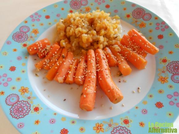 6. Espolvoremos con sésamo y ya podemos servir las zanahorias con la verdurita de acompañamiento osi preferirmos salsa, tenemos que batir la cebolla y el orejón con un poco de agua.