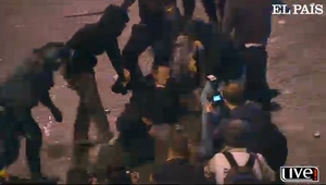 En este vídeo se observa, desde el principio, el ridículo teatrillo de unos con banderas y escudos «mu enfadaos» y los antidisturbios delante bastante tranquilos. Curioso que en el momento de mayor tensión, en que unos manifestantes usan técnicas de guerrilla a tres metros del cordón policial, los antidisturbios se dediquen a charlar entre ellos, a apartar a los fotógrafos, y a llamar a más agentes a primera línea. «Venga, Rodríguez, hombre, que si no esto no va a quedar creíble. Ande, deje esas pastillas y póngase aquí, que van a ser dos minutos». Y efectivamente, en dos minutos los unos atacan y desaparecen (para aparecer luego deteniendo a varios asistentes) y los otros comienzan a correr apaleando a lo que se encuentran. Repito que el club de teatro amateur de mi antiguo colegio lo hubiese hecho mejor. Aquí el teatrillo: