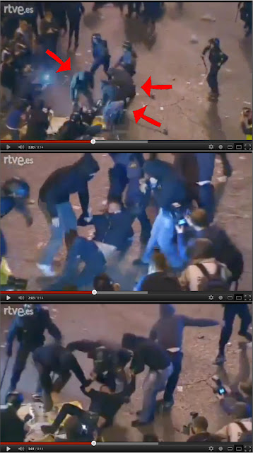 Ahora observen este vídeo. En los primeros instantes del mismo un grupo de encapuchados con unas banderas rojas y negras provocan a los antidisturbios que comienzan una carga. Malditos comunistas. O anarquistas. O lo que sean. Pues de hecho, lo que son es probablemente el peor grupo de teatro que haya habido en la policía: avancen hasta el instante 2:50 y observen a esos mismos encapuchados, sudaderas negras y vaqueros, que arrastran a un manifestante hasta las inmediaciones de las furgonas, donde los UIP de uniforme se encargan de recogerle y proceder a la detención.