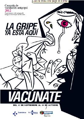 El cartel de la campaña de vacunación antigripal de 2012 del País Vasco no tiene desperdicio. De resonancias picasianas (recuerda al cuadro del bombardeo sobre Gernika), es puro espectáculo de marketing del miedo. A ver si ahora va a ser que contraer la gripe es como tener a la aviación alemana sobrevolándote… y bombardeándote.
