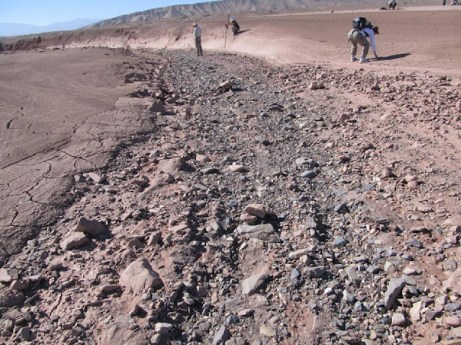 | Por encima de la imagen muestra un cauce seco de un abanico aluvial en el desierto de Atacama, Chile, mostrando la típica mezcla irregular y heterogénea de tamaños de grano depositados juntos. En Marte, Curiosity ha visto dos afloramientos rocosos próximos a su lugar de aterrizaje Bradbury que también registran una mezcla de arena y guijarros transportados por el agua que probablemente fueron depositados a lo largo de un cauce antiguo | Crédito de la imagen:. UC Berkeley |