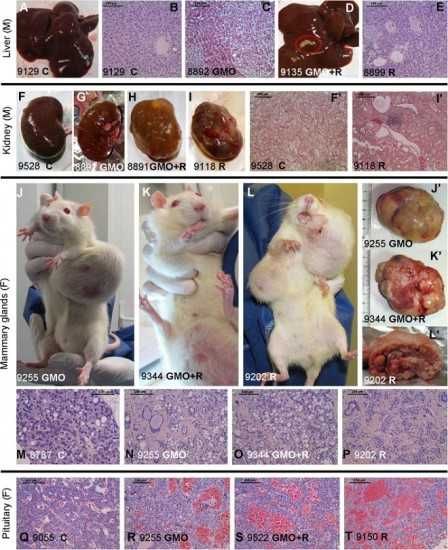 En las hembras aparecieron tumores mamarios que alcanzaron hasta una cuarta parte de su peso. En los machos, los órganos depuradores – riñones e hígado- fueron afectados por anomalías severas con una frecuencia entre 2 y 5 veces mayor que en los roedores no sometidos al OGM.