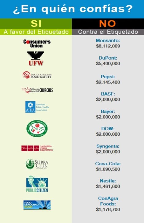 Como respuesta plataformas como Yo no quiero Transgénicos dieron en su página una infografía en la quedetallan la lista de las empresas que apoyaron la iniciativa, y quienes, por el contrario, la rechazaron realizando un fuerte lobby, cuestión que también fue dada a conocer a través del Los Angeles Times