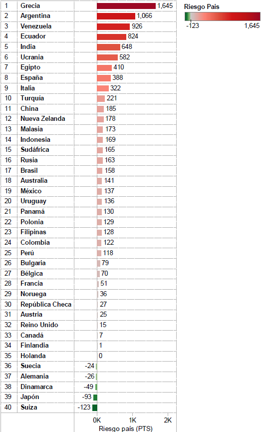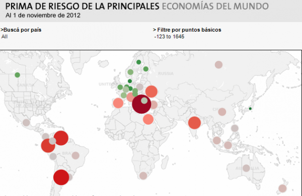 A continuación mostramos un gráfico con las mayores economías del mundo y su prima de riesgo comparada con la estadounidense tomando las cifras del primer día del presente mes: