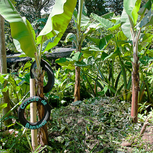 Además de todo lo anterior, especies como los plátanos crecen bien en “éste círculo”. Tanto los plátanos, como las papayas prosperan muy bien en el orificio central en estos ambientes, donde se alimentan de los nutrientes de la materia orgánica en continua descomposición.