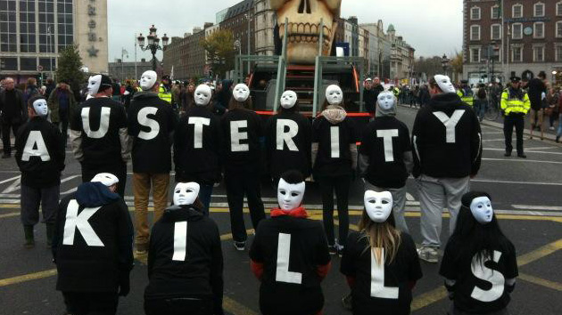 Su intervención fue aplaudida por Tom Healy, director del Instituto de Investigaciones Económicas Nevin (NERI), quien desfiló con otros colegas de profesión tras una pancarta que decía: “Economistas contra los recortes”.