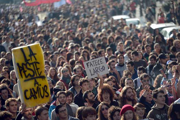 Los estudiantes se concentraron en la Plaza de la República junto a los miembros del sindicato Cobas que acudieron a la protesta. Al iniciarse la marcha, los sindicalistas gritaron “Viva Palestina, boicot a Israel”, con pancartas alusivas también a la crisis: “Año tras año nos estamos ahogando”.