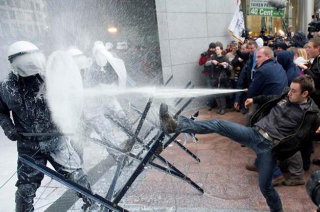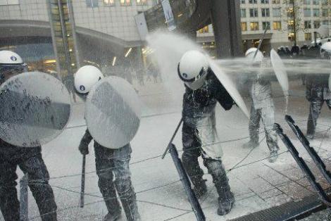La policía belga empleó gases lacrimógenos para dispersar una manifestación de unos 2.000 granjeros en el centro de Bruselas, quienes regaron 15.000 litros de leche frente a las oficinas de la Unión Europea (UE).