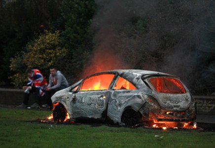 Loyalists sit near a burning car in east Belfast, Northern Ireland on December 8, 2012 after a march in protest against Belfast city council’s decision to restrict the number of days the Union Flag will be flown over the city hall. Protests have broken out since Belfast city councillors voted to restrict the number of days the Union Flag will fly above City Hall from everyday, to 17, meaning it will be taken down for the first time since the building opened in 1906. Police said around 1,000 people rioted in Belfast after the controversial Union flag vote on December 3, with 15 officers, two security workers and a press photographer were injured during the clashes. AFP PHOTO/ PETER MUHLY