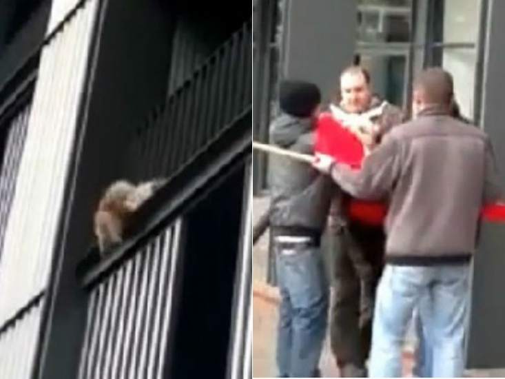 87852-733-550 Publicado 11 de diciembre de 2012 en 733 × 550 en Unos manifestantes le salvan la vida a un perro en una protesta en la Torre Iberdrola en Bilbao