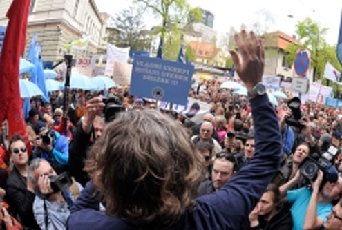 “¡No crean en los que dicen, que la situación mejorará si despiden a los empleados sanitarios, policías o enfermeras!”, dijo a la multitud Branimir Strukelj, un reconocido dirigente sindical.