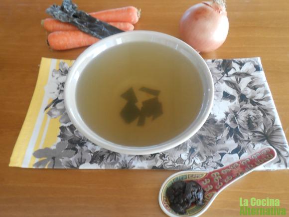Verduras de tierra y verduras del mar (algas) con todas sus propiedades desintoxicantes y alcalinizantes y su alto contenido en yodo, clorofila y ácido algínico, son los ingredientes de este caldito que nos calentará, sentará muy bien y depurará: