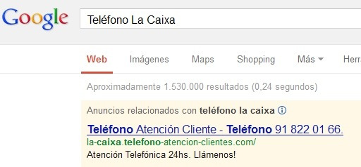 Si acudimos a Google y tecleamos en el buscador por ejemplo “Número de teléfono de Amazon o Número de teléfono de la Caixa” nos vamos a encontrar en las primeras posiciones y en color salmón un anuncio que invita a llamar a un número con prefijo de Madrid (918220166) para obtener información. Hasta aquí ningún problema ya que puede salirte gratis la llamada si tienes tarifa plana a fijos o pagarás el precio que te cobre tu operador.