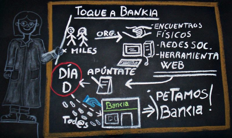 La iniciativa, a la que ya se han sumado asambleas del 15-M, de la PAH, grupos dehacktivistas y de afectados por las preferentes, pretende articular una acción simultánea en la que “miles de personas” acudan, “camuflados” como clientes, a preguntar por los productos ofertados y plantear dudas infinitas, de manera que la actividad de la sucursal quede colapsada.
