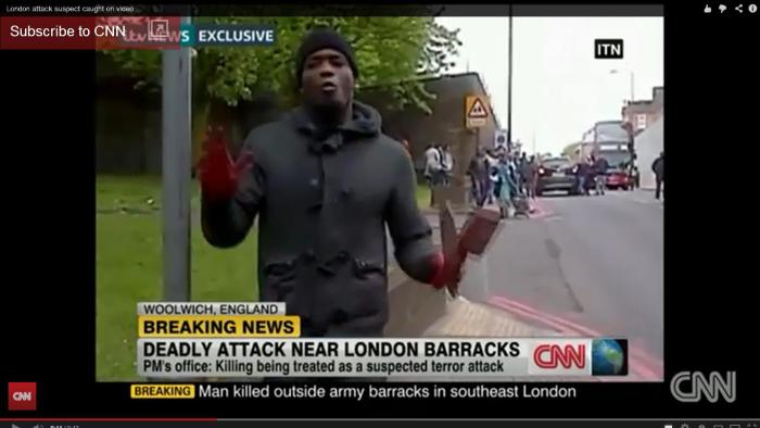 Demasiado parecido a una película de los Hermanos Coen o Tarantino, ¿verdad? Un asesino sin motivo, que deambula sonámbulo por la calle mientras las cámaras de televisión le filman en primer plano, una heroína que se le acerca y le increpa sin que le pase nada… Ha sido tan descarado que algunos diarios digitales han comenzado a cuestionar el reality show, atendiendo, por ejemplo, a la cercanía de la comisaría (y sin embargo, tardó 20 minutos en llegar); por no hablar de que los hechos se producen al lado de un cuartel. ¿A qué asesino se le ocurre matar a un soldado al lado de un cuartel? Esta misma información española también se pregunta cómo es que el asesino sabía que su víctima era militar si sólo llevaba una camiseta…