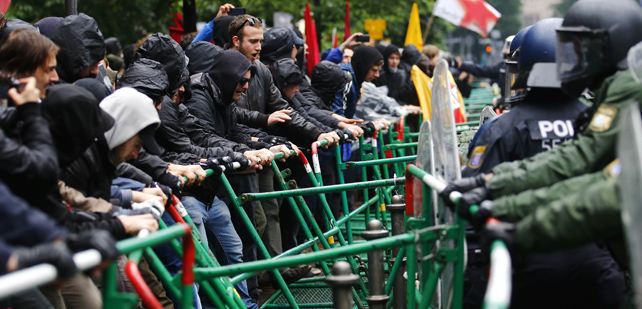 Los manifestantes, unas 2.500 personas según la Policía, han sido recibidos por policías armados con cascos y equipación antidisturbios y perros. Había camiones con cañones de agua y un helicóptero sobrevolaba la zona.