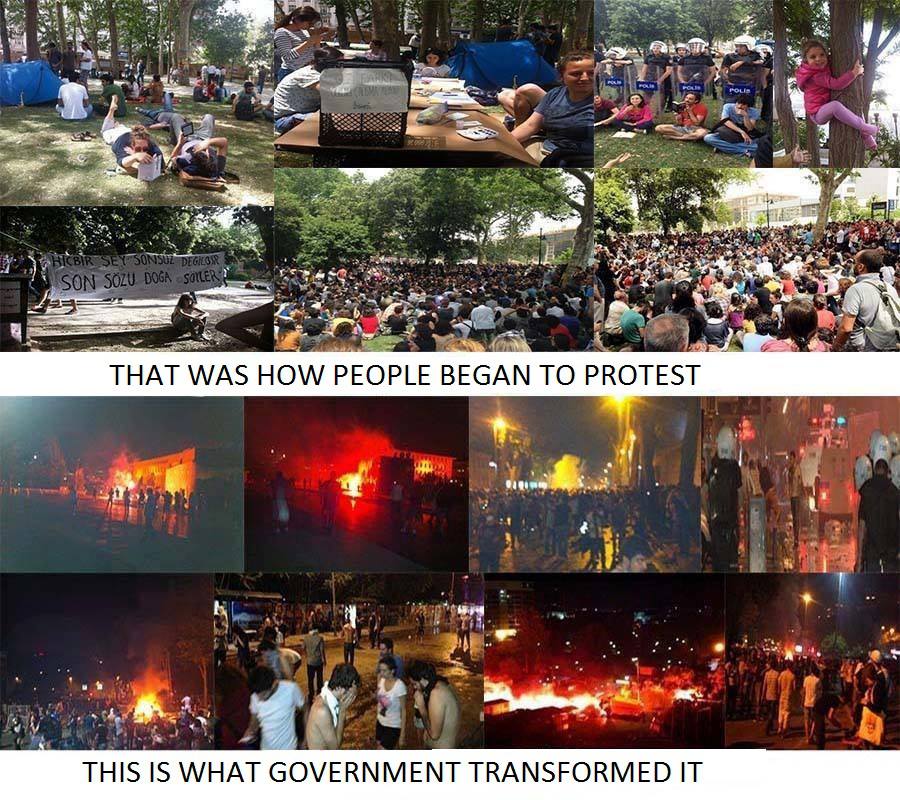 Lo que empezó como una acampada de ecologistas para salvar un parque público a punto de caer en las garras del capitalismo, para ser convertido en un centro comercial, se ha transformado en una revuelta de policías armados (gases lacrimógenos, pistolas de pelotas de acero, agua a presión, porrazos….) contra ciudadanos y ciudadanas desarmados, que se defienden con lo que van encontrando a su paso.