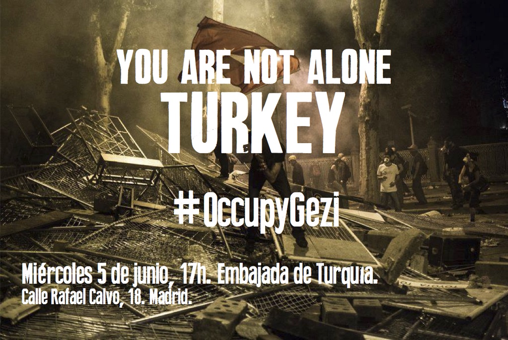 Apoyamos la protesta que se ha ido trasformando desde un grupo de personas intentando parar la destrucción de un parque en una marea inmensa que ha rellenado calles, plazas y puentes de Estambul, para defender la posibilidad misma de la gente de retomar el derecho a opinar, decidir y gobernarse a si misma contra las lógicas de mercantilización de los espacio públicos, la privatización, la imposición brutal del poder, un modelo económico al servicio del capital, la manipulación de los medios