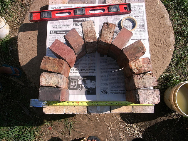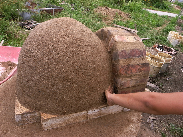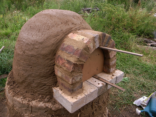 Antes de la construcción de la cúpula real, hacer una puerta con arco de ladrillo rojo re-utilizado, pegados con mortero arena / arcilla. (La entrada es un poco estrecha de 12 pulgadas de ancho y se puede trabajar con eso muy bien. No se puede hacer pizzas muy grandes, sin embargo, con esta medida. La cúpula (no es más que una mezcla de arena y arcilla en una proporción de 3:1) fue construida cuidadosamente en torno a arena húmeda cubierta con papel periódico mojado y arriba contra el arco de ladrillo. La arena fue sacada por la puerta después de que la cúpula se había secado un poco.